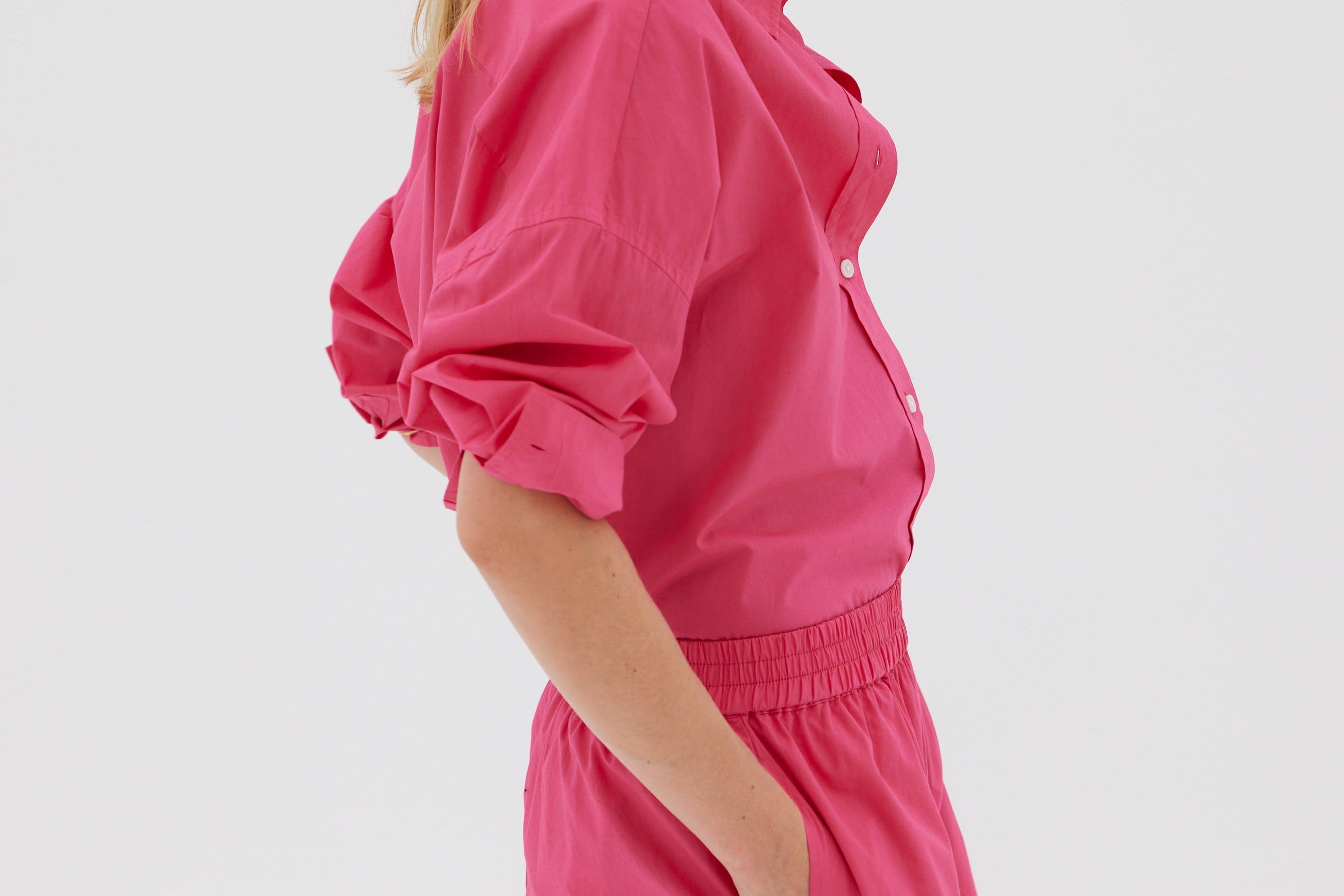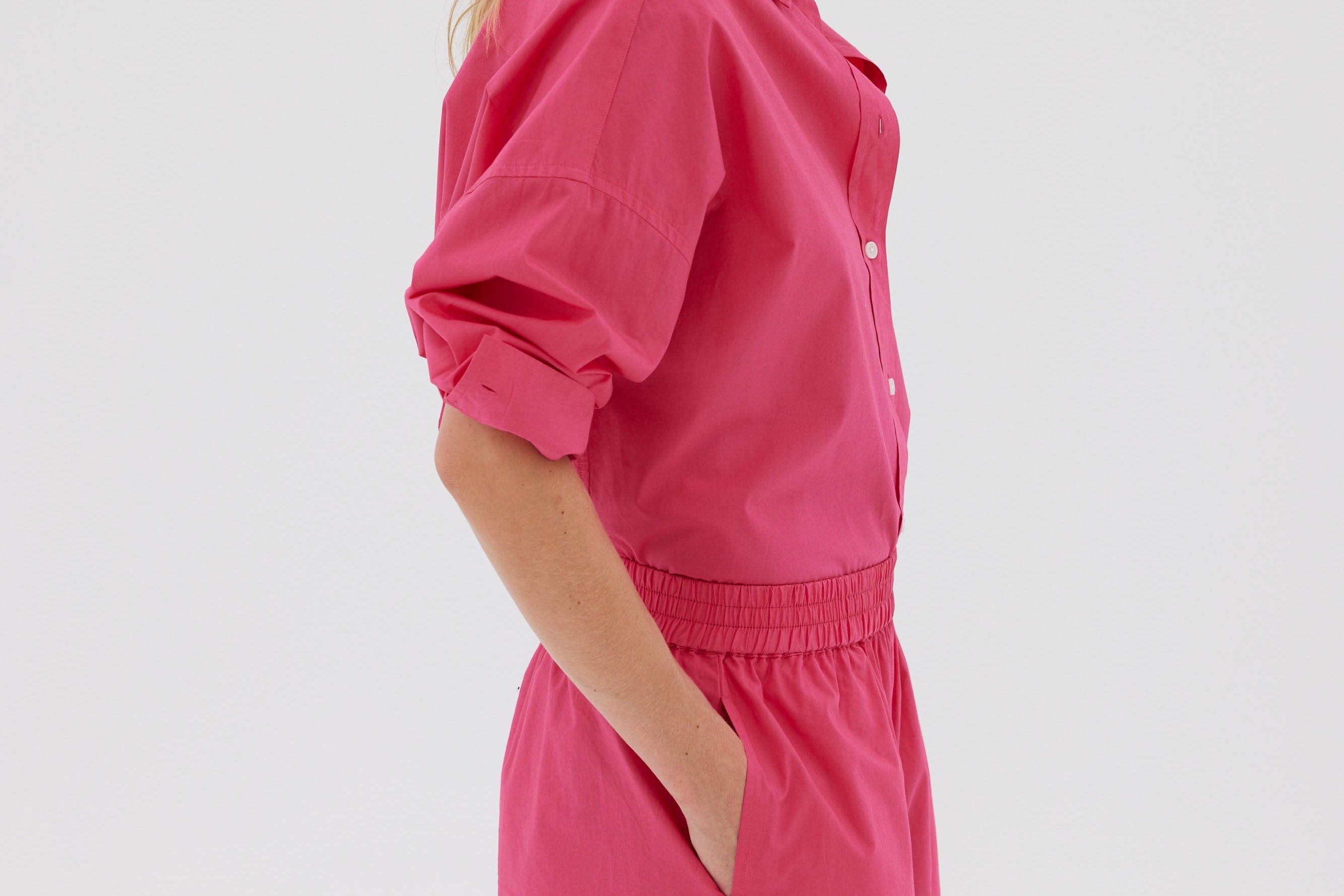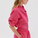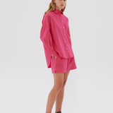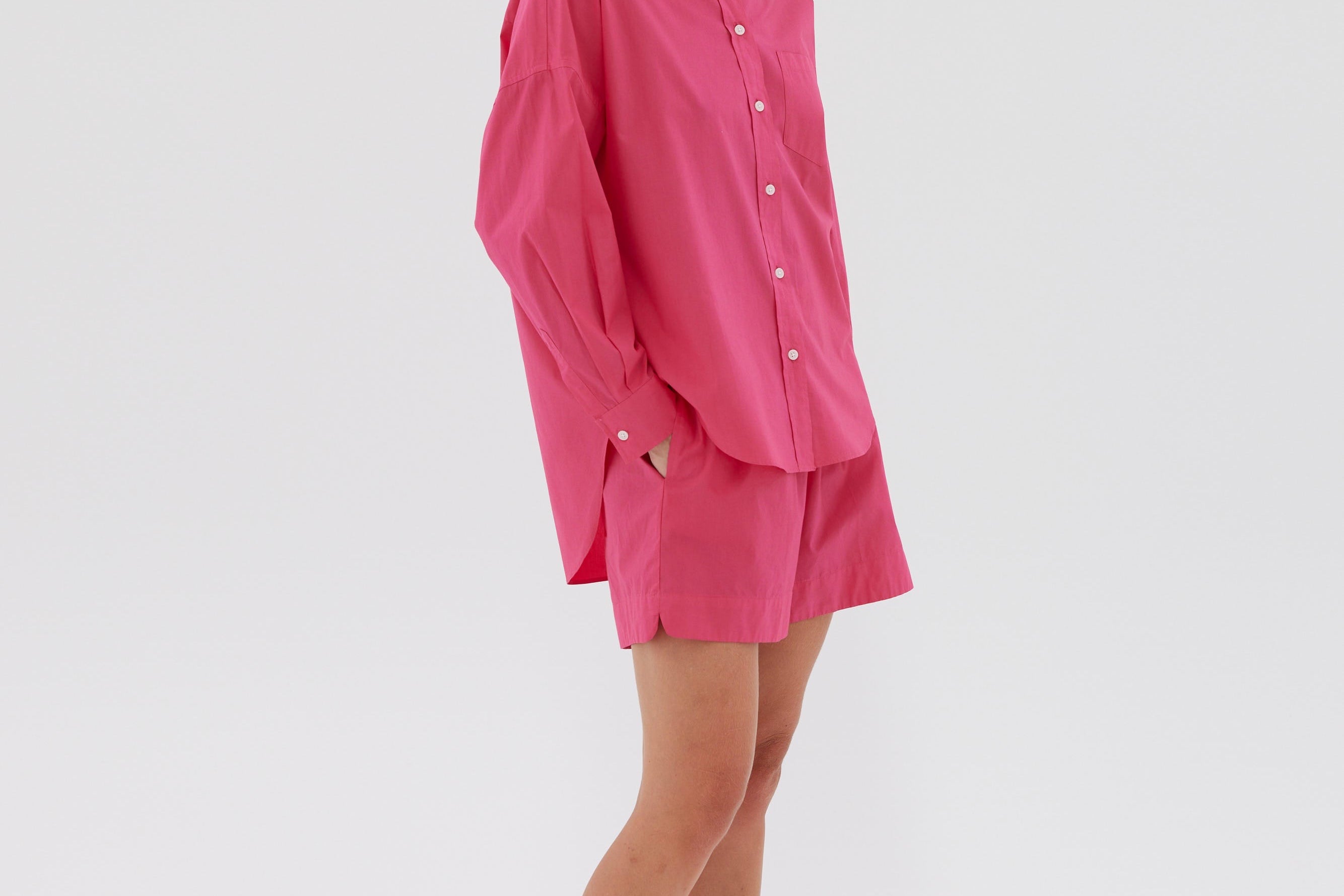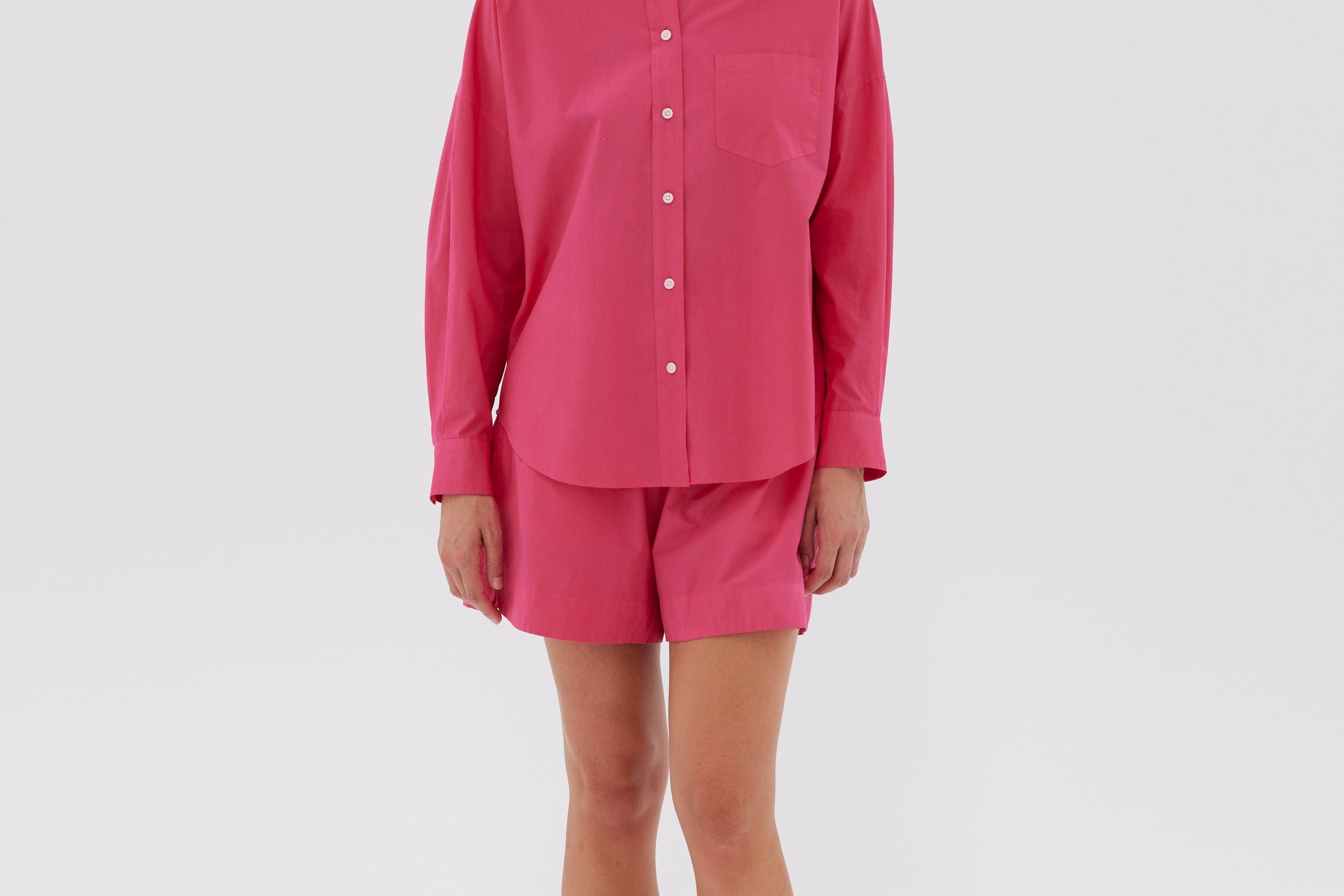 Our Signature Classic button-up shirt. Crafted from premium 100% cotton, this timeless piece features a chest pocket and a relaxed, slightly loose silhouette with drop shoulders. Its versatile design makes it ideal for layering underneath cozy knitwear or pairing with our matching Chiara shorts for a chic coordinated look.