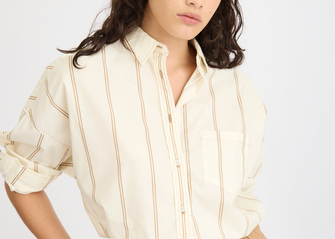 Effortless, timeless, and designed to be worn on repeat. The Chiara Long Sleeve Shirt in Toffee and Ivory Double Pinstripe is a softer, more refined take on our signature classic.