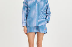 Introducing our Signature Classic Button-Up Shirt, featuring a stripe detail. Expertly crafted from 100% yarn-dyed cotton, this shirt effortlessly combines style and comfort. The design includes a practical chest pocket and our signature drop shoulders, creating a slightly loose silhouette perfect for layering under cozy knitwear or pairing with your favourite Chiara shorts.