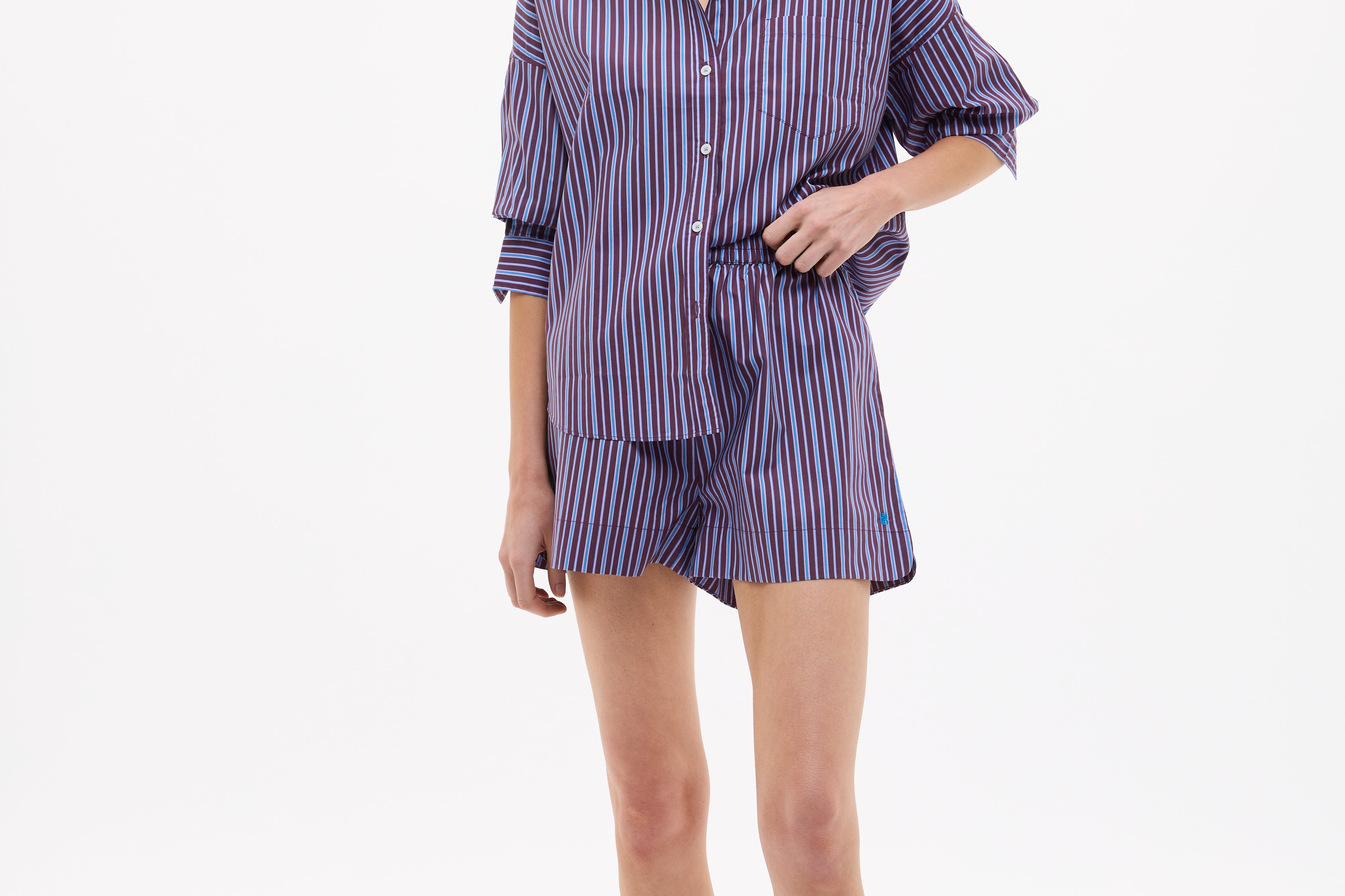 Lightweight and breathable, it layers neatly under knits on cooler days or pairs back with Chiara shorts when the weather warms up. Anchored in our signature Ink Blue, this stripe delivers everyday polish with ease.