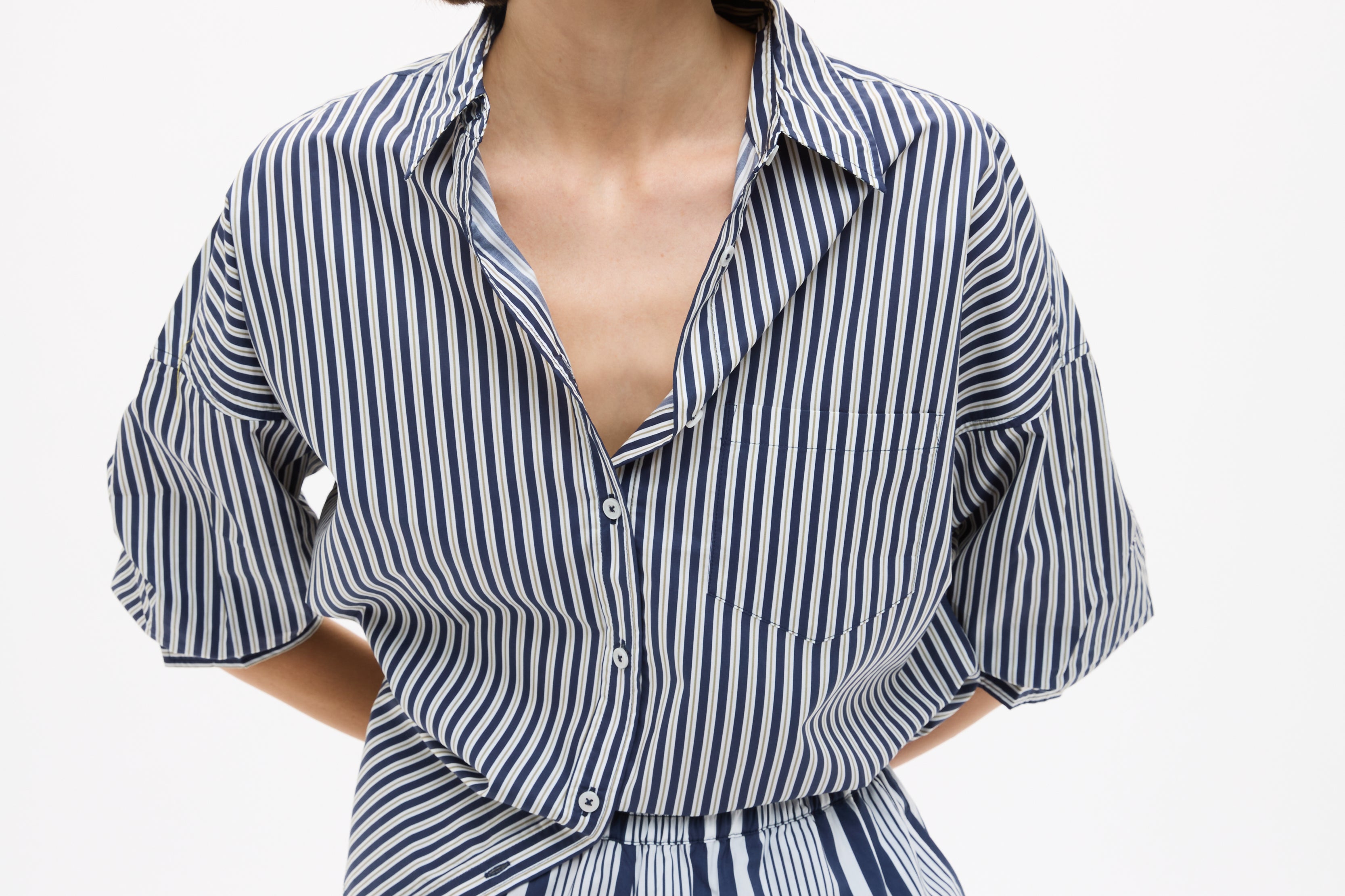 Effortless, timeless, and designed to be worn on repeat. The Chiara Long Sleeve Shirt in Navy, Sponge and Natural stripe is a refined take on our signature classic, grounded in one of LMND’s most loved palettes.