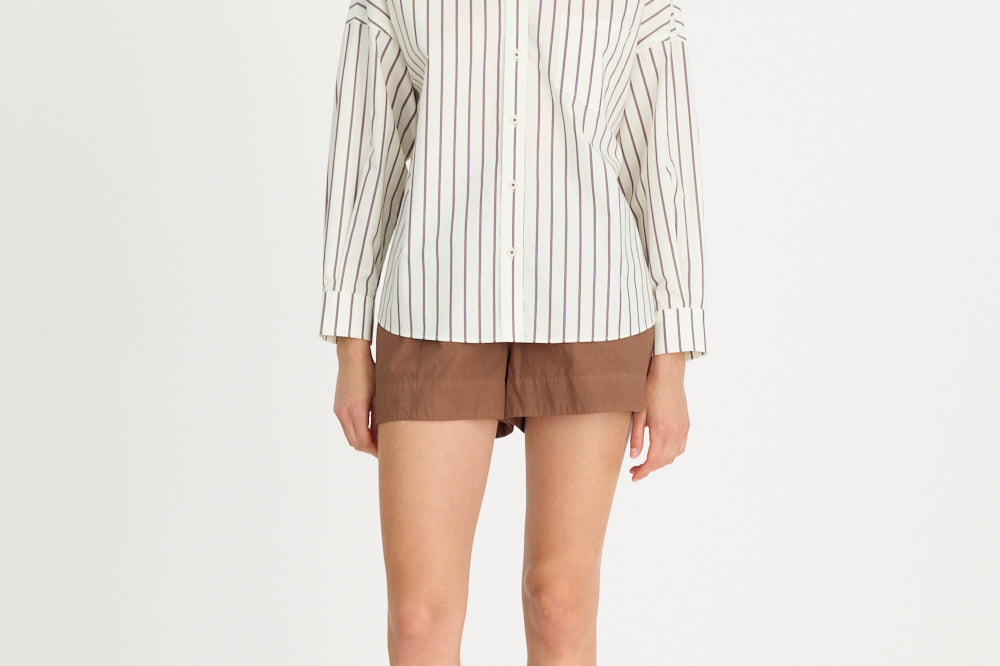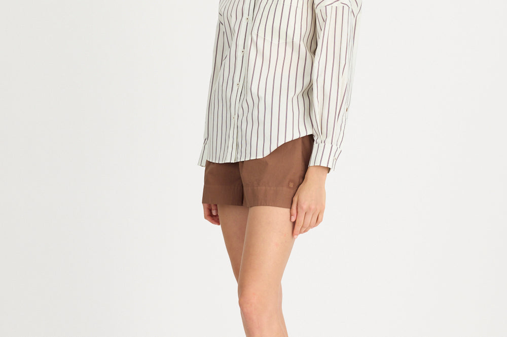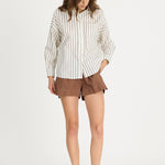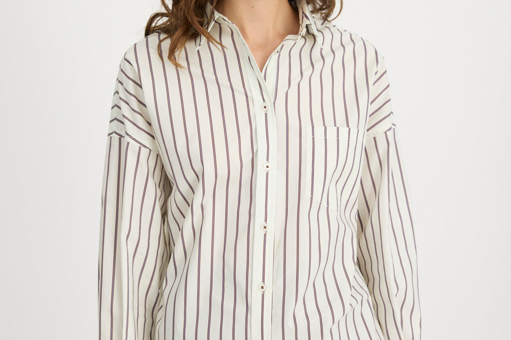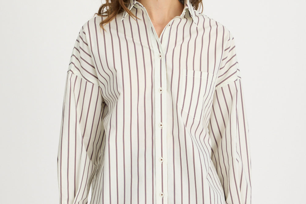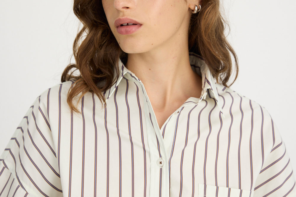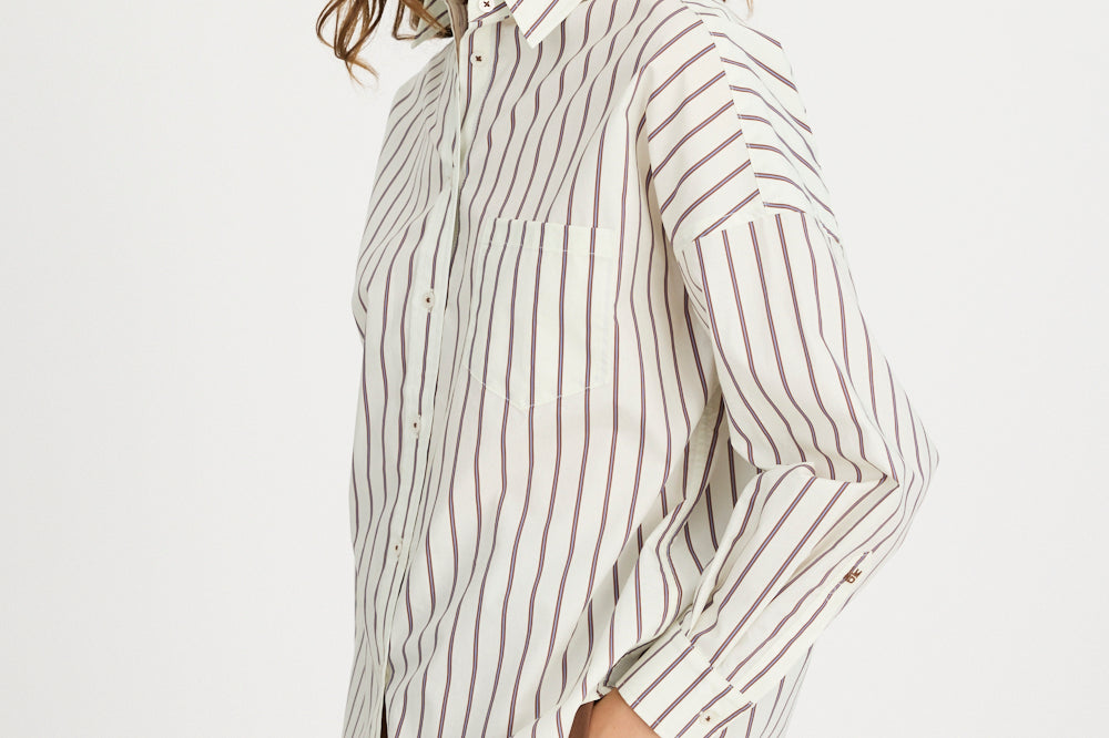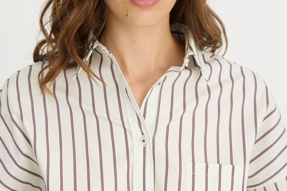 Lightweight and breathable, it layers seamlessly under cozy knitwear on cooler days or pairs effortlessly with our Chiara shorts for an easy summer look. Dress it up or down the Vanilla Stripe brings understated polish to any outfit.