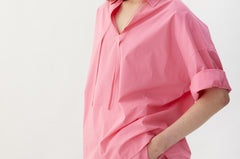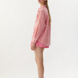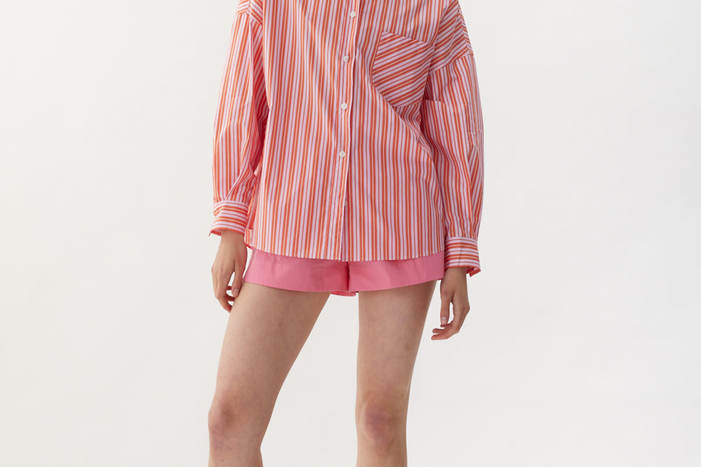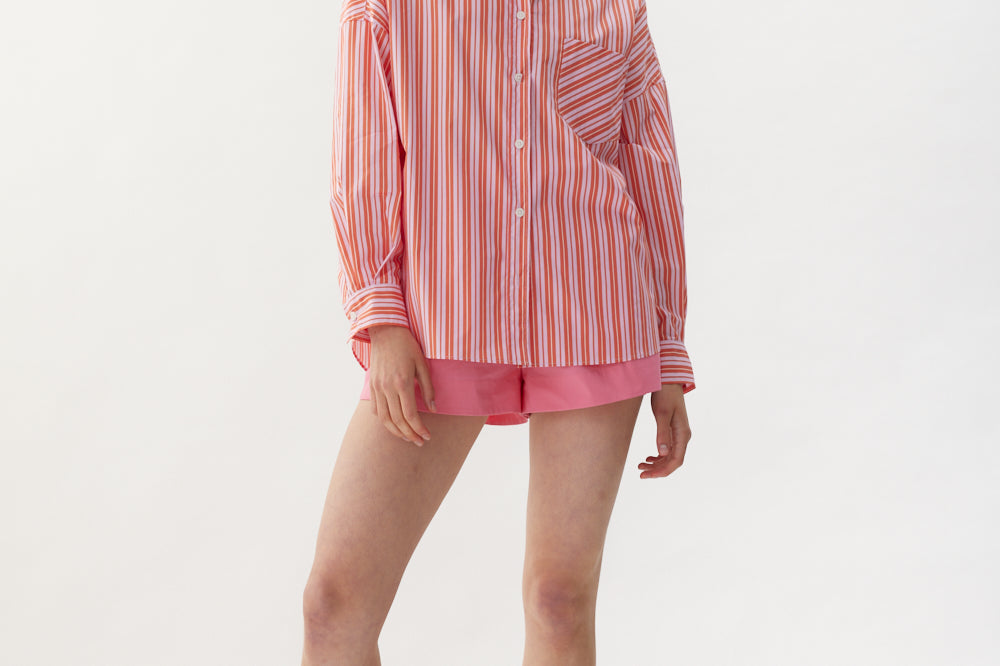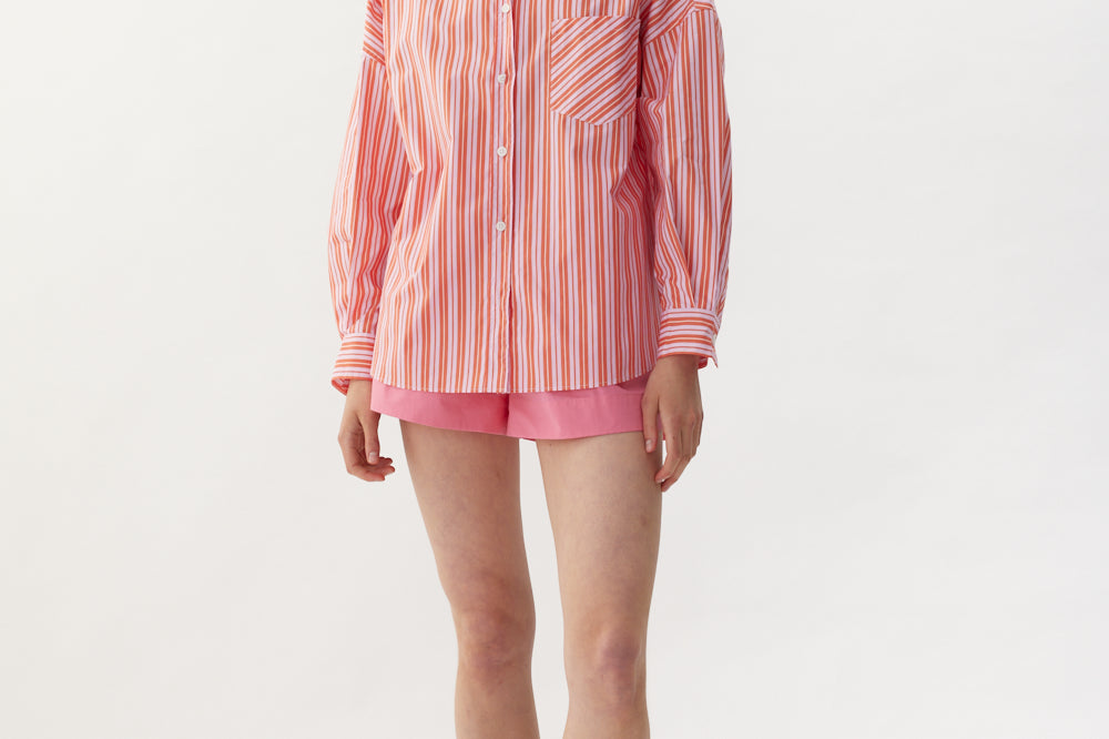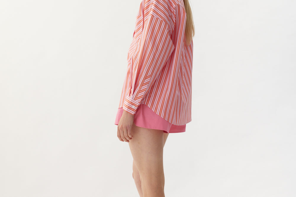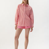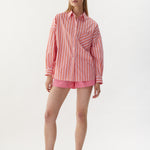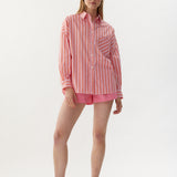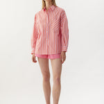 Our Signature Classic button-up shirt featuring customized stripe detail. Crafted from 100% yarn-dyed cotton, this shirt exudes both style and comfort. Features a chest pocket and our signature drop shoulders, creating a slightly loose silhouette that is perfect for layering under cozy knitwear or pairing with your favorite Chiara shorts.