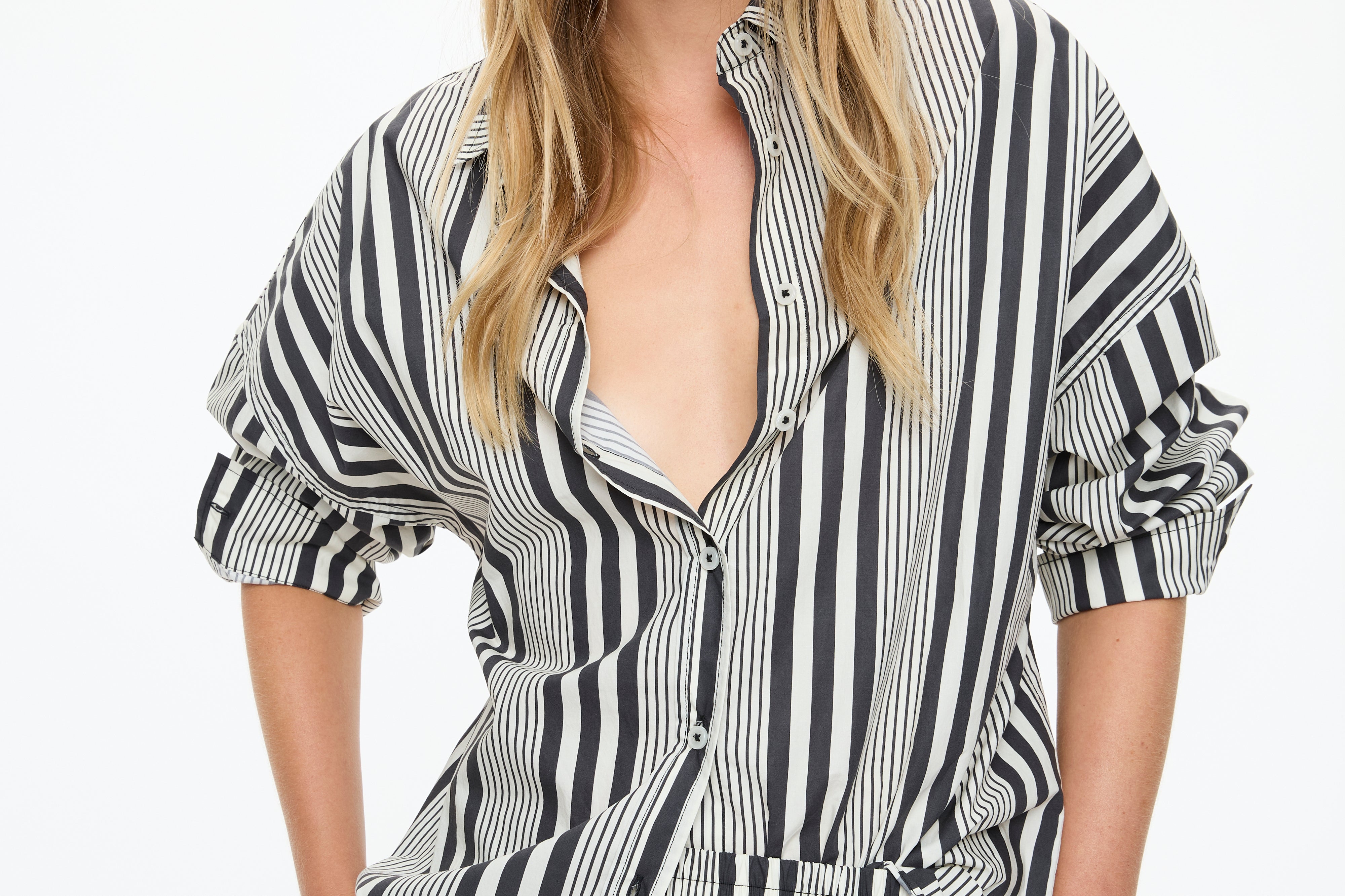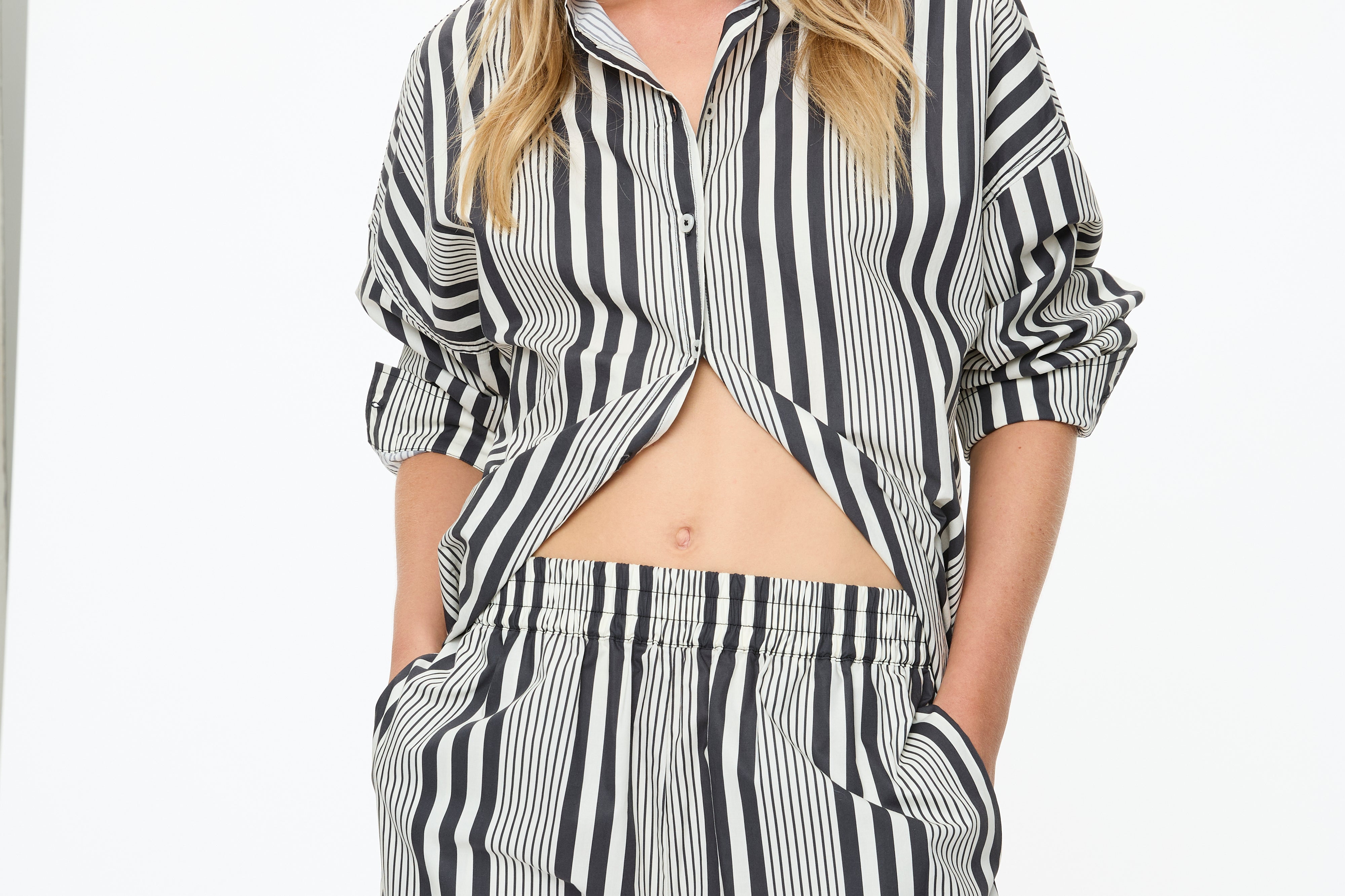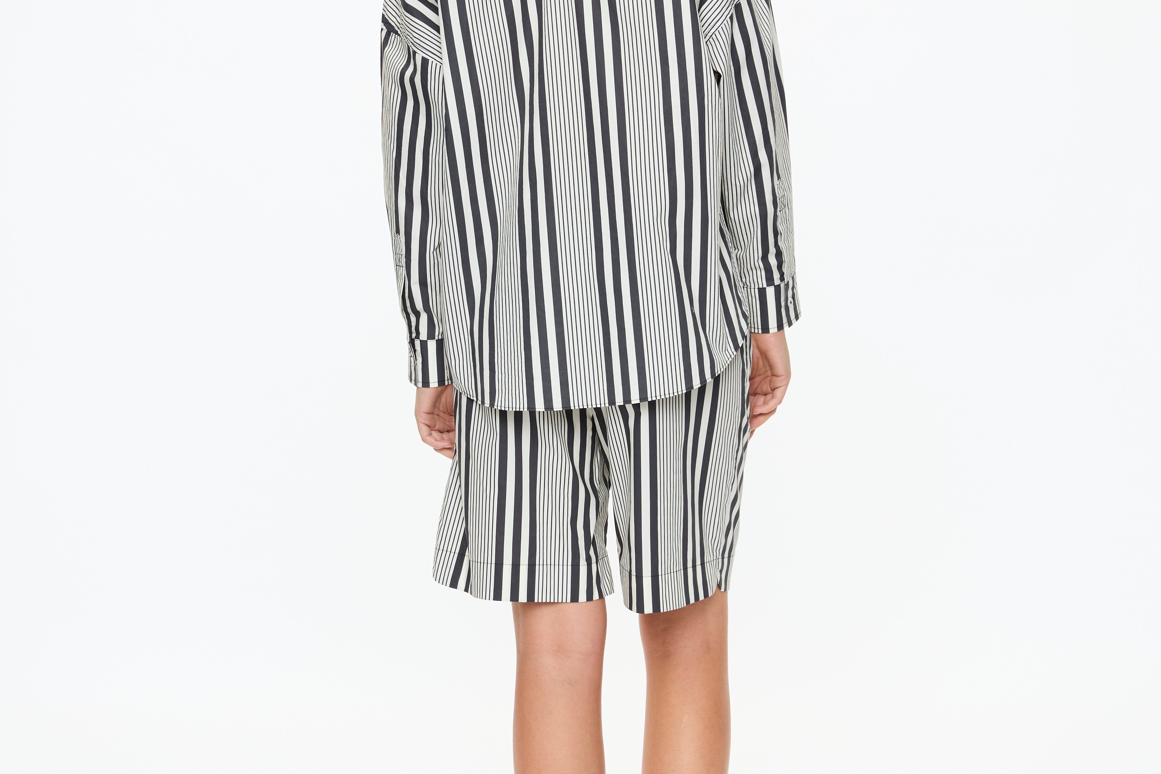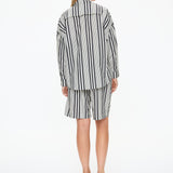 The Chiara Open Yoke Shirt in Black and White Stripe is a modern take on a timeless classic. Cut in our signature relaxed Chiara fit, it features an open back yoke detail that adds ease and a subtle point of difference.