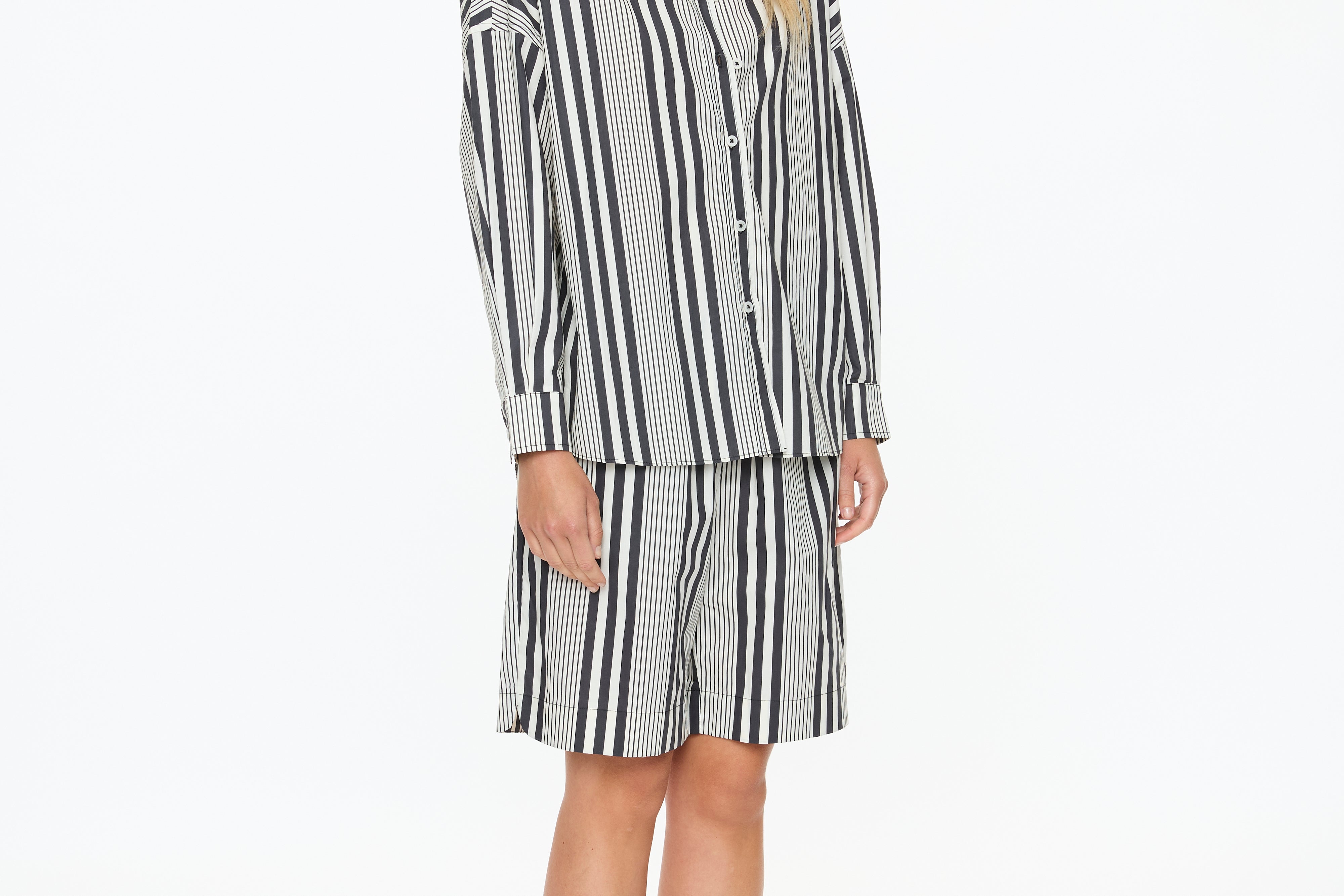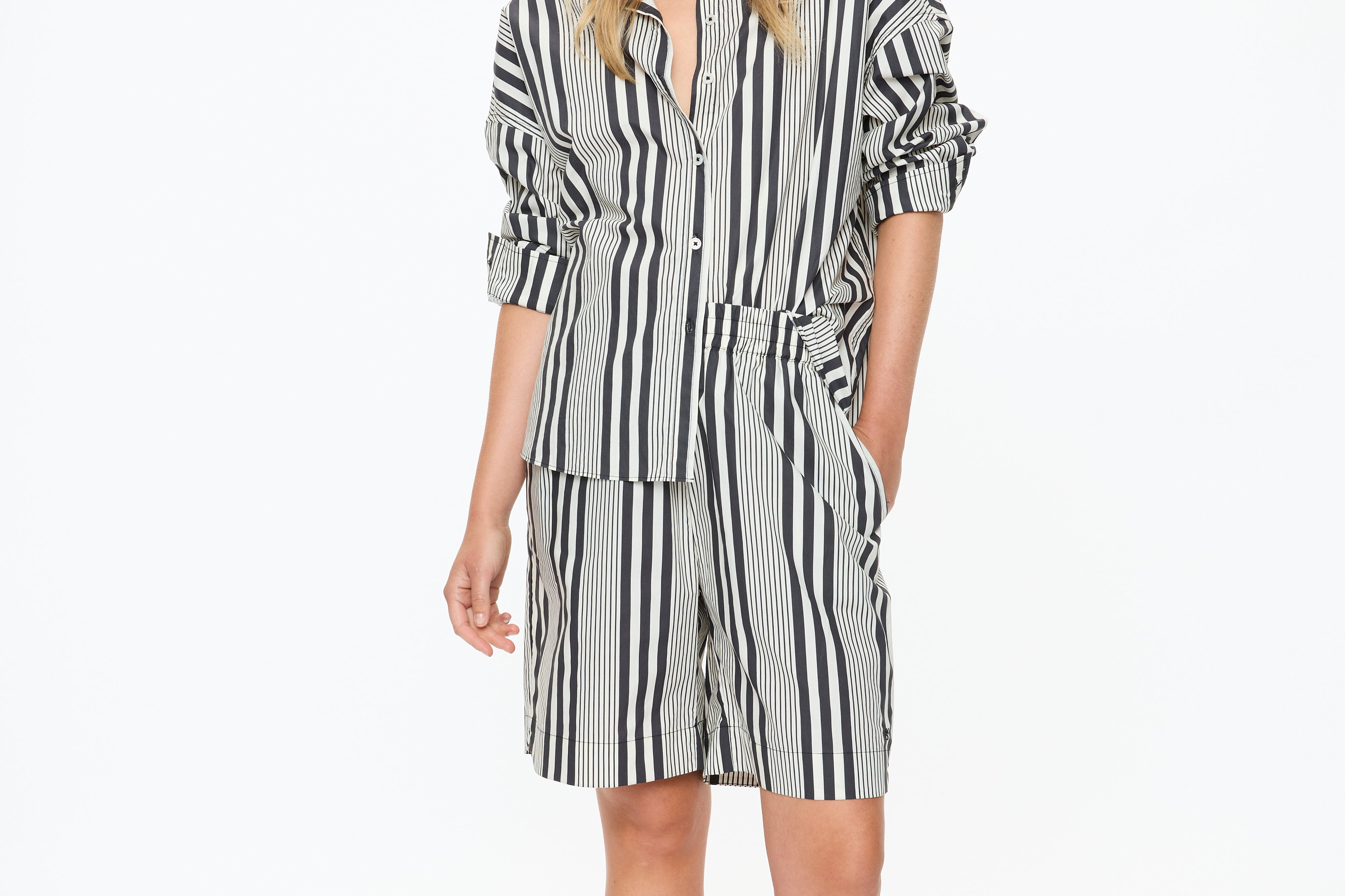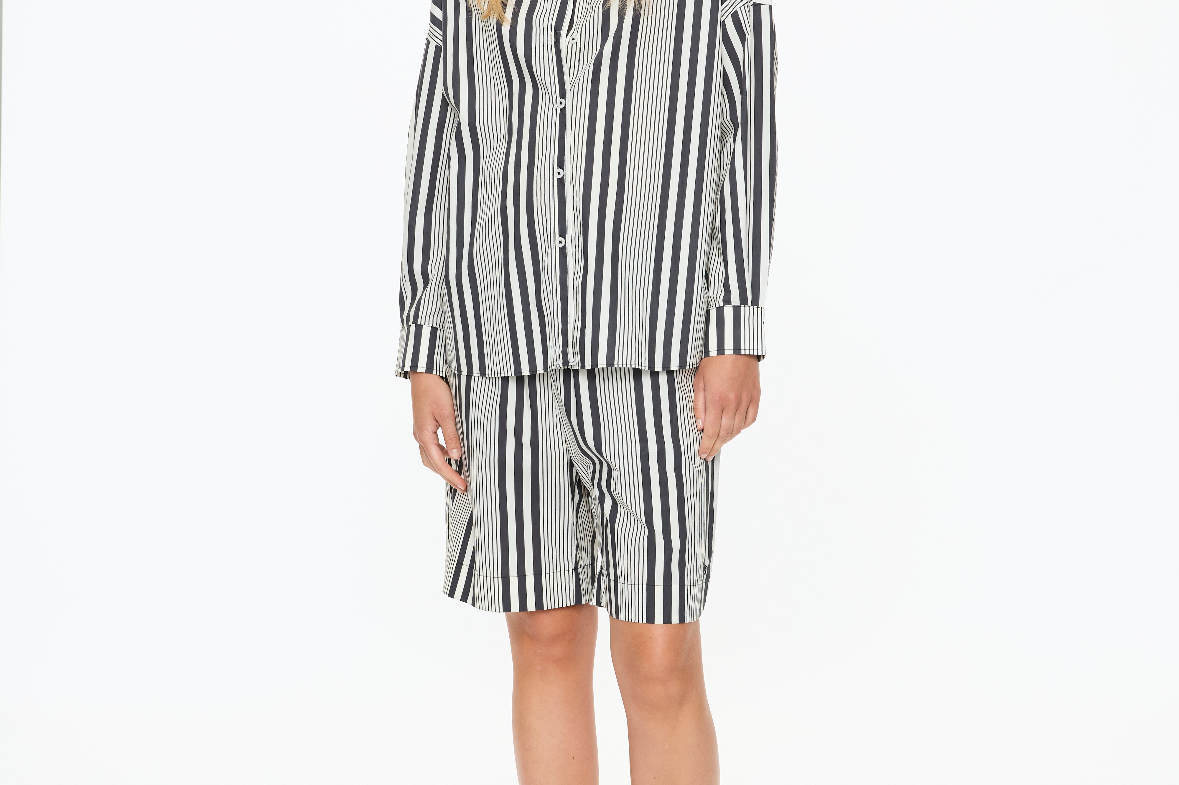 The Chiara Open Yoke Shirt in Black and White Stripe is a modern take on a timeless classic. Cut in our signature relaxed Chiara fit, it features an open back yoke detail that adds ease and a subtle point of difference.