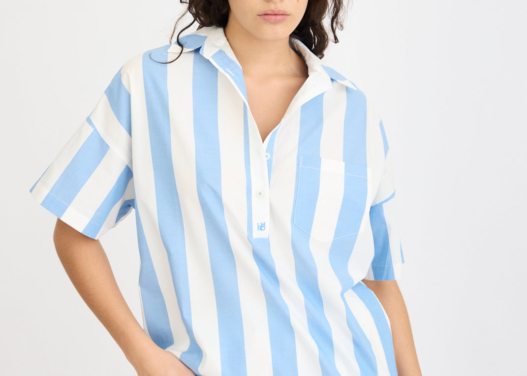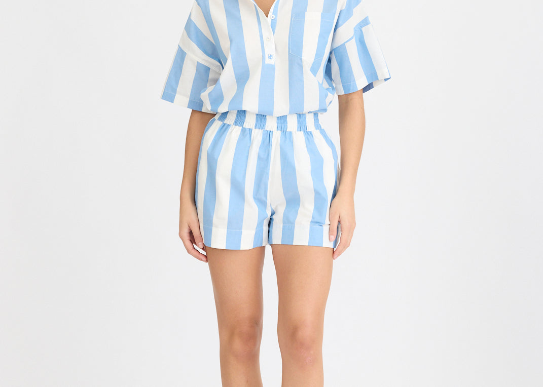 Upgrade your summer wardrobe with the Chiara Shorts in our signature yarn-dyed stripes. Crafted from premium 100% organic cotton poplin, these shorts combine elevated style with effortless comfort. The elasticated waistband offers a flexible fit, while the relaxed leg and side slip pockets keep the look easy and laid-back.