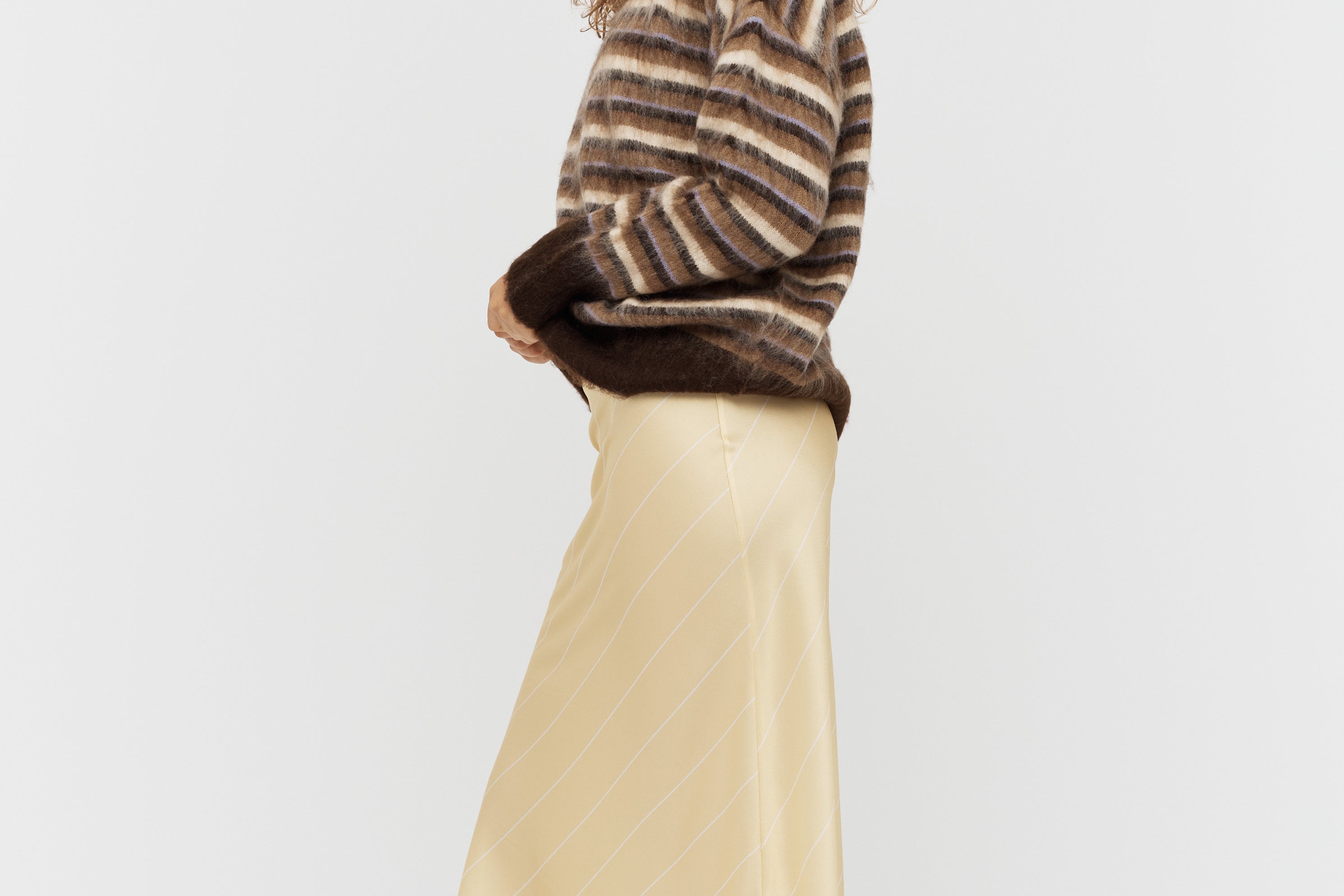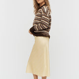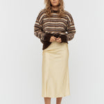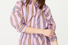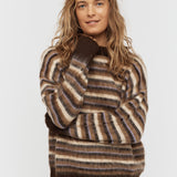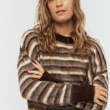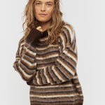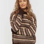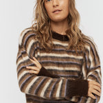 Elevate your wardrobe with The Dakota Sweater, designed to be a staple in your layered outfits. Featuring our signature drop shoulder fit, this sweater offers simplicity and ease in mixing and matching with various pieces. The tonal-chocolate hues complemented by a neon violet stripe create a striking look, perfectly paired with Cotton Chiara Shorts or Denim.
