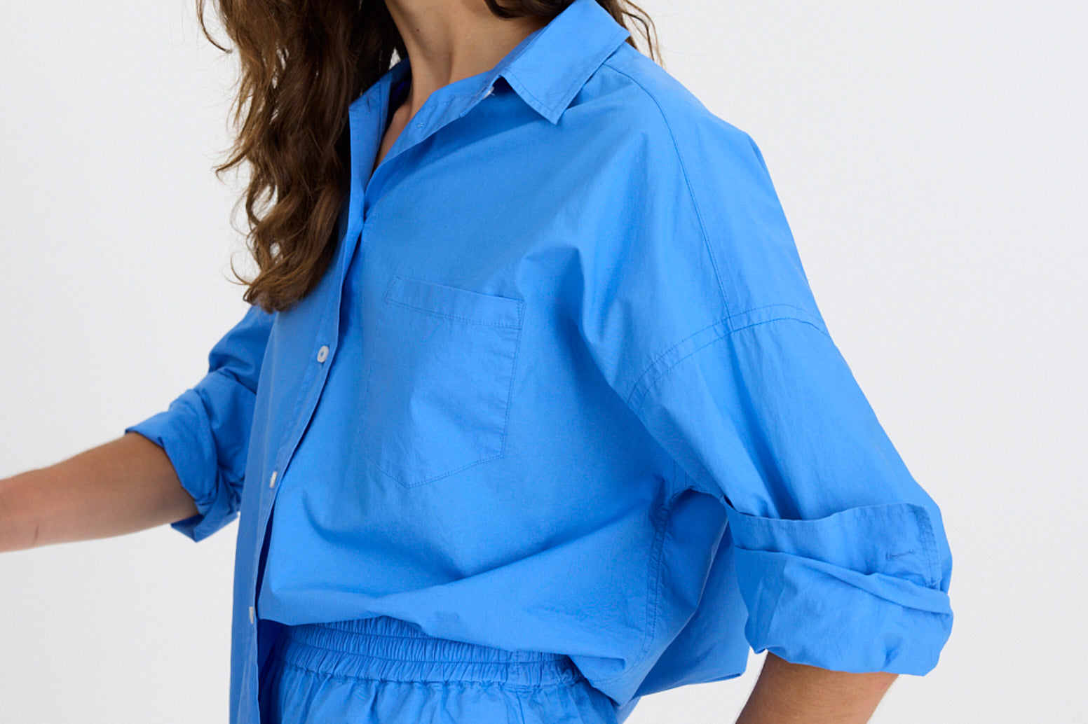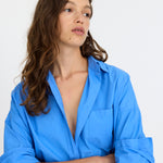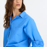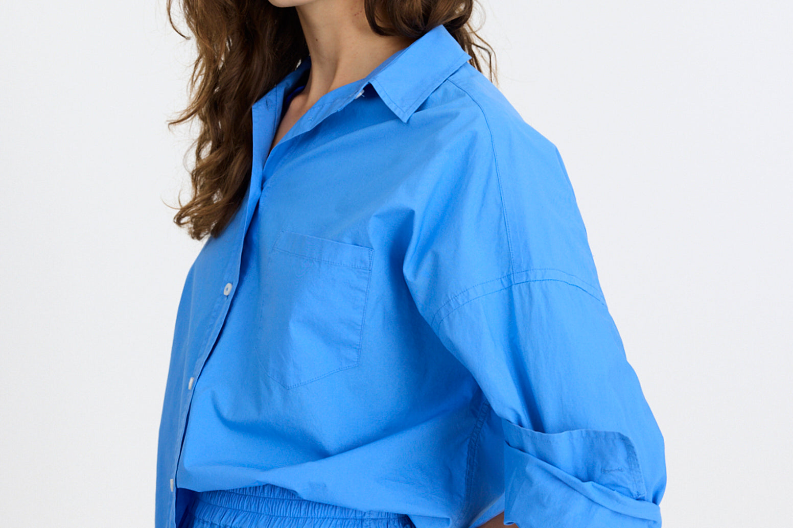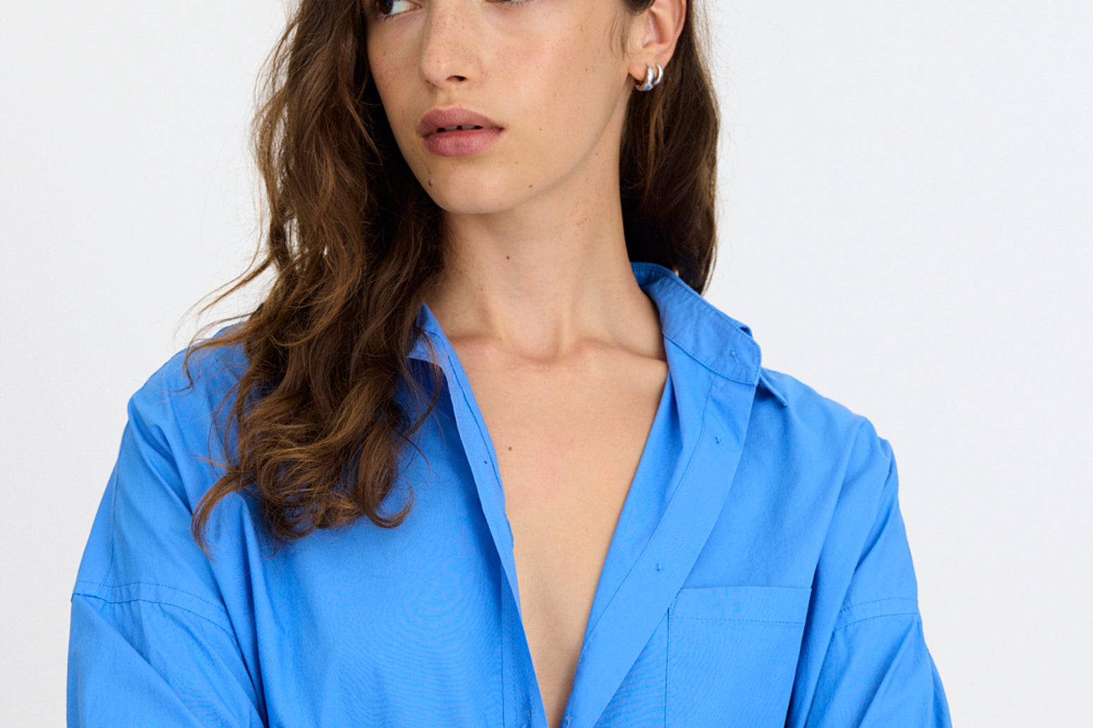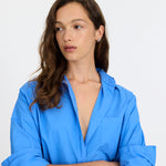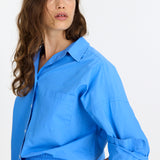 Our Signature Classic button-up shirt. Crafted from premium 100% cotton, this timeless piece features a chest pocket and a relaxed, slightly loose silhouette with drop shoulders. Its versatile design makes it ideal for layering underneath cozy knitwear or pairing with our matching Chiara shorts for a chic coordinated look.